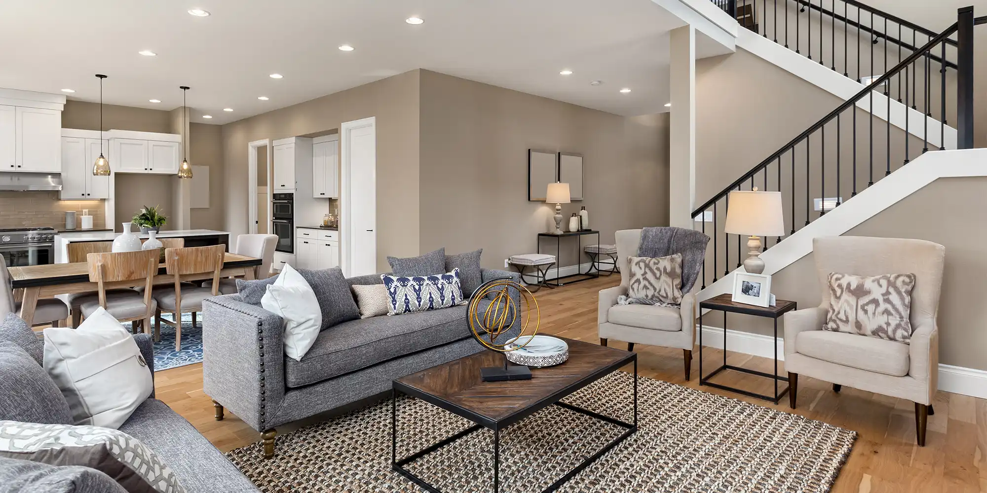 By its simplest definition, open concept means an interior where at least two common spaces are in the same room. These layouts eliminate walls and doors between dining rooms, kitchens, and living rooms to form a single open area or “great room.”
